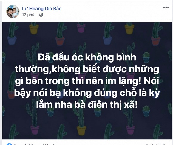 Không chỉ công chúng, giới nghệ sĩ cũng không hề hài lòng với Lan Phương. Trong đó, diễn viên Gia Bảo đã gay gắt viết trên trang cá nhân: “Đã đầu óc không bình thường, không biết được những gì bên trong thì nên im lặng! Nói bậy nói bạ không đúng chỗ là kỳ lắm nha bà điên thị xã!”
