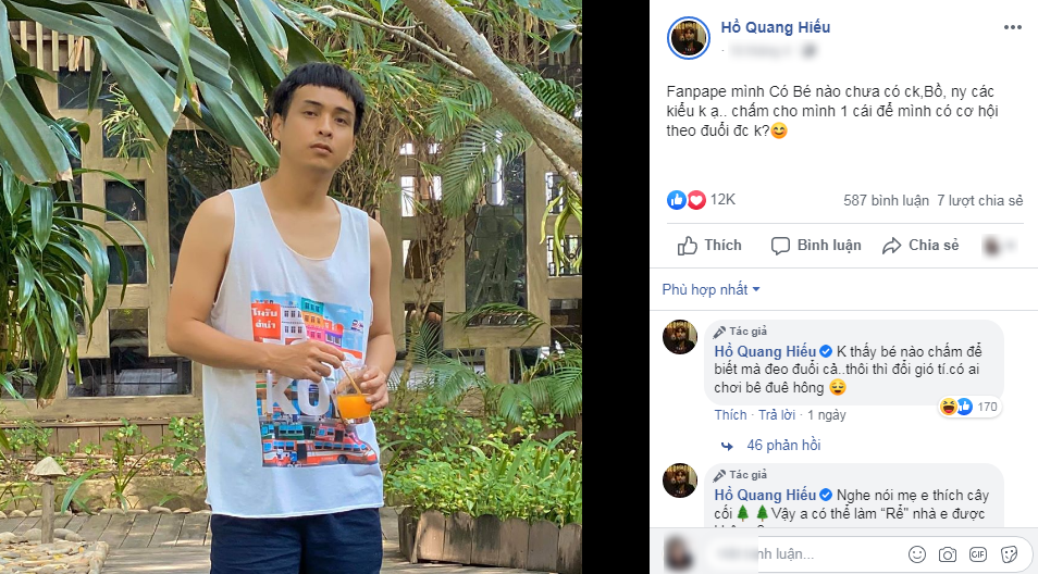 Mới đây, Hồ Quang HIếu đã công khai tìm bạn gái trên mạng xã hội. Anh hài hước nói: “Fanpage mình có bé nào chưa chồng, bồ, người yêu các kiểu không ạ,… Chấm cho mình 1 cái để mình có cơ hội theo đuổi được không?”. Ngay lập tức dòng trạng thái trên trang cá nhân của nam ca sĩ khiến CĐM dậy sóng. Ai nấy cũng phải bật cười vì chiêu thức tán tỉnh mới này.