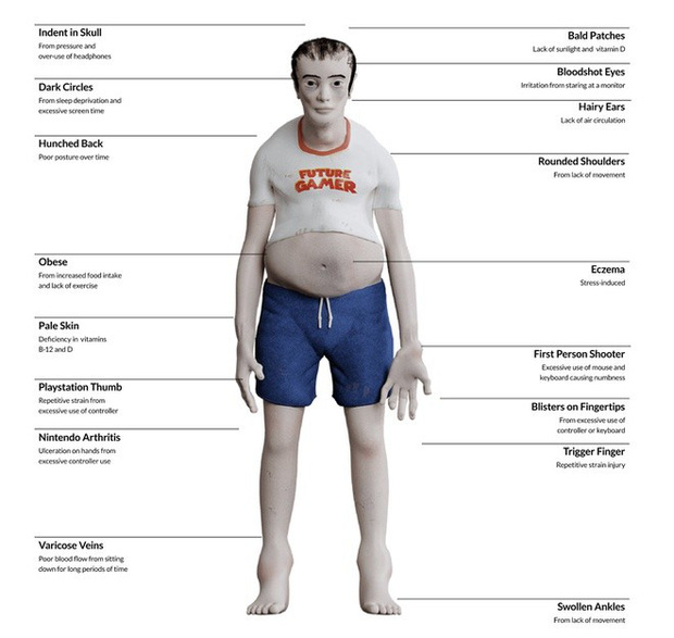 Cơ thể sẽ biến đổi thế nào nếu chơi game hàng chục tiếng mỗi ngày?Mới đây, một nhóm nghiên cứu tại Mỹ, dưa trên các dữ liệu cung cấp bởi tổ chức y tế thế giới WHO đã tạo ra mô hình mô phỏng ngoại hình người nghiện game. Theo nghiên cứu, mô hình này sẽ cho thấy những tác động tới hình thể của 1 người giữ thói quen chơi game quá đà liên tục sau 20 năm.