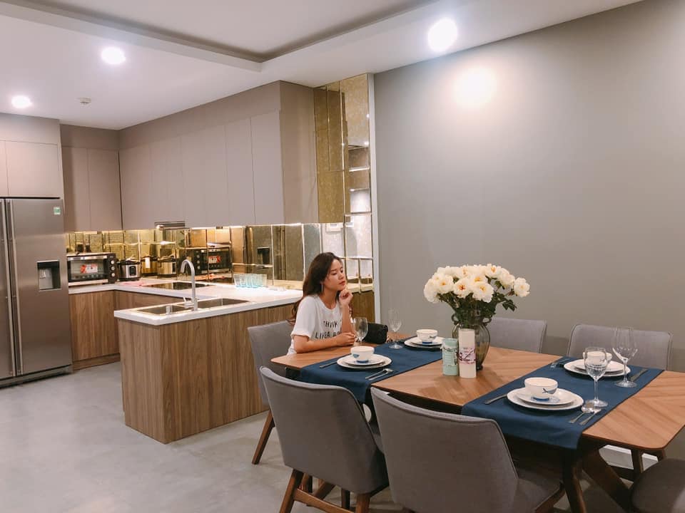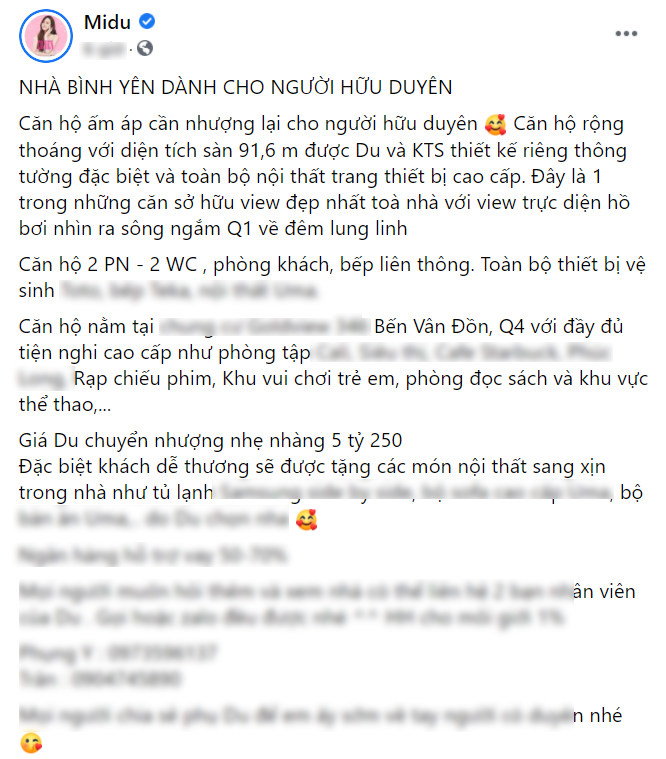 "Căn hộ ấm áp cần nhượng lại cho người hữu duyên. Căn hộ rộng thoáng với diện tích sàn 91,6 m được Du và kiến trúc sư thiết kế riêng thông tường đặc biệt và toàn bộ nội thất trang thiết bị cao cấp. Đây là 1 trong những căn sở hữu view đẹp nhất toà nhà với view trực diện hồ bơi nhìn ra sông ngắm Q1 về đêm lung linh. Căn hộ 2 PN - 2 WC , phòng khách, bếp liên thông", Midu cho biết.
