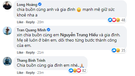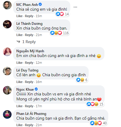 Ngô Kiến Huy đau lòng: “Xin chia buồn cùng ông bạn”, MC Phan Anh cũng để lời nhắn động viên đàn em: “Chia sẻ cùng em và gia đình”. Nam ca sĩ Lou Hoàng vô cùng xót xa, động viên người bạn của mình: “Chia buồn cùng anh và gia đình. Mạnh mẽ giữ sức khỏe nha anh”. Trịnh Thăng Bình cũng để lại lời nhắn chia buồn: “Chia buồn cùng gia đình em nhé”.
