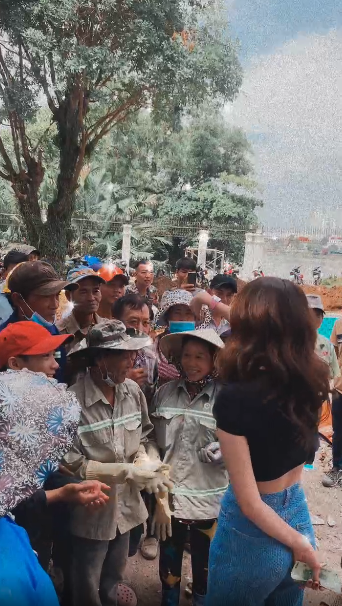 Ngọc Trinh còn không ngần ngại cầm sấp tiền 200 triệu đồng để tặng cho hơn 40 công nhân đang làm việc, coi như món quà tri ân đến mọi người đang làm việc vất vả cũng như lì xì đầu tuần.