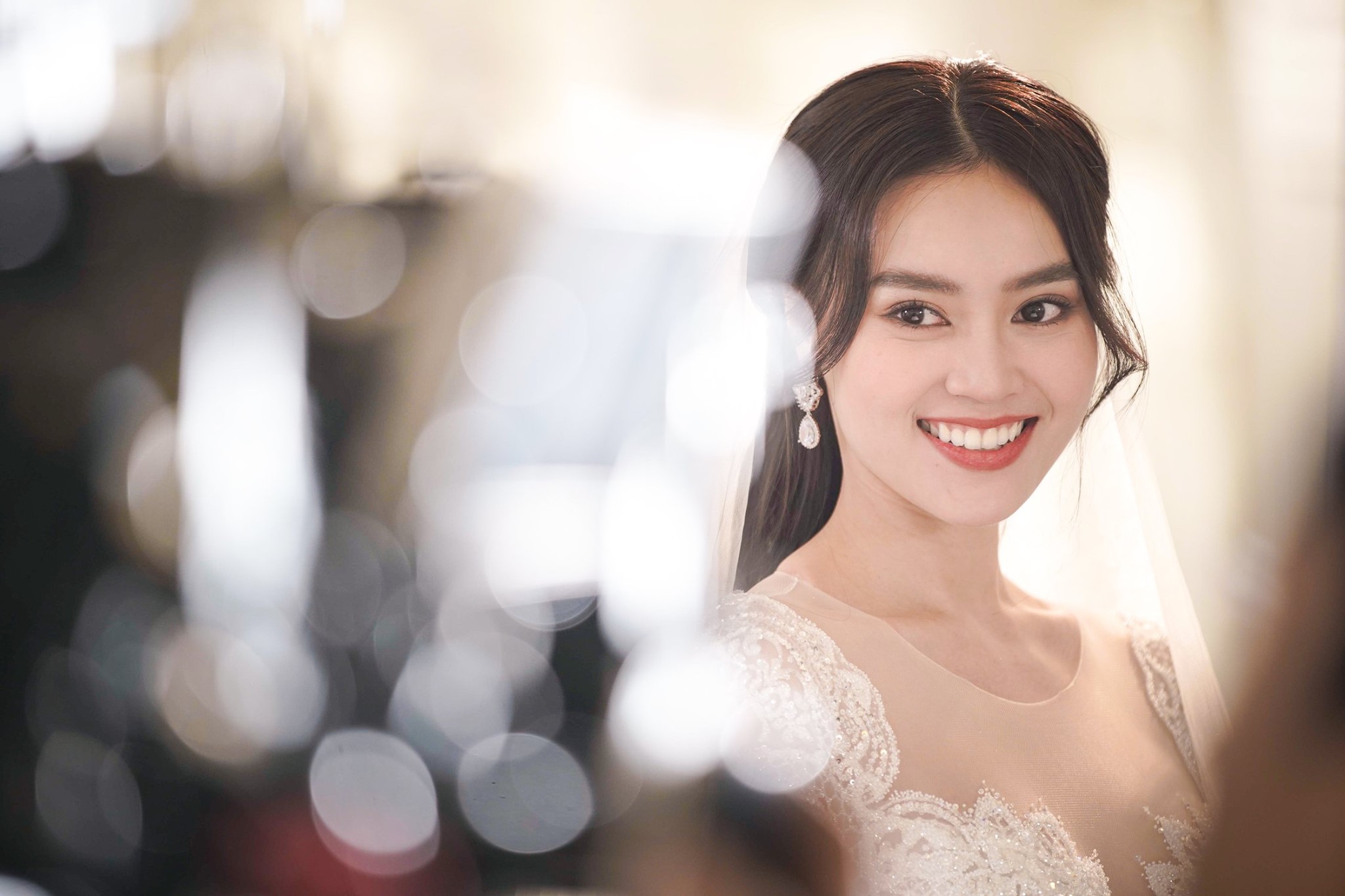 Qua đó, Lan Ngọc đăng ảnh diện váy cưới trắng muối, độ khăn voan và trang điểm vô cùng xinh đẹp. Mỹ nhân sinh năm 1990 còn khoe: “Cuối cùng Ngọc cũng được làm cô dâu”.