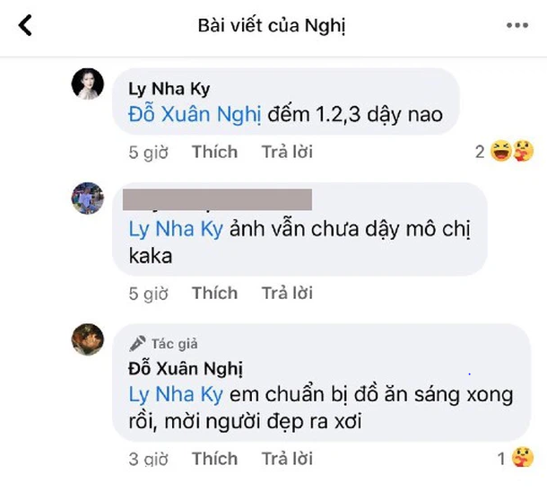 Không những vậy, cặp “chị - em” mới của làng giải trí Việt còn khiến fan bất ngờ khi công khai “thả thính”. Trong một phần bình luận dưới bài viết của Xuân Nghị, người đẹp họ Lý để lại icon đáng yêu. Ngay lập tức, đằng trai nhắc khéo về việc ngủ cùng giờ: “Đếm 1, 2, 3 rồi đi ngủ cùng giờ nha,... 1... 2... 3... khò…”. Tới sáng hôm sau, Lý Nhã Kỳ cũng hài hước gọi Xuân Nghị dậy: “Đếm 1, 2, 3 dậy nào”. Rất nhạy bén, đằng trai còn chuẩn bị sẵn đồ: “Em chuẩn bị đồ ăn sáng xong rồi, mời người đẹp ra xơi”.