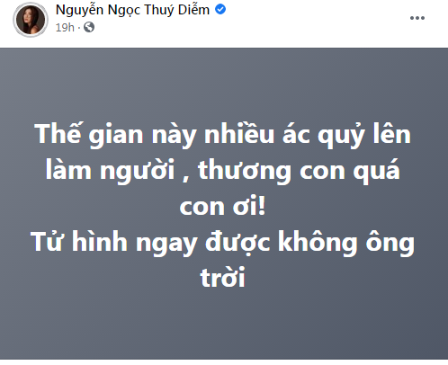 Trên trang cá nhân, diễn viên Thúy Diễm bức xúc cho biết: “Thế gian này nhiều ác quỷ lên làm người, thương con quá con ơi". Trò chuyện với mọi người, bà xã Lương Thế Thành gay gắt: “Ức quá… loài súc vật này phải xử sao cho đáng tội. Không dám tưởng tượng nổi, thời đại bây giờ đáng sợ quá, phải bảo vệ con nhỏ".