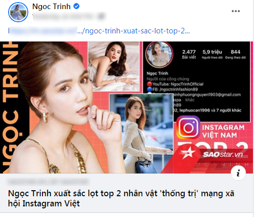Cụ thể, Ngọc Trinh đã đợt tới con số 5,9 triệu người theo dõi, xếp thứ 2 chỉ sau nam ca sĩ Sơn Tùng M-TP. Người đẹp gốc Trà Vinh cũng trở thành nghệ sĩ nữ có lượng người follow nhiều nhất Việt Nam. Điều đó chứng tỏ cô đang có một sức ảnh hưởng không hề nhỏ tới giới trẻ hiện nay.