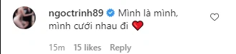 Đáng chú ý nhất chính là dòng bình luận của Ngọc Trinh và Vũ Khắc Tiệp dưới bài đăng. Cụ thể, ngay sau khi Vũ Khắc Tiệp "nhá hàng" hình ảnh biệt thự, Ngọc Trinh liền vào bình luận: "Mình là mình, mình cưới nhau đi". Vũ Khắc Tiệp liền phản hồi: "Cưới thôi nè".