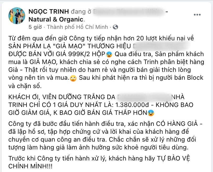Cụ thể, “nữ hoàng nội y” đã đăng đàn khi phải nhận tới 20 đơn khiếu nại về ngộ độc sau khi sử dụng sản phẩm của công ty mình. Qua đó, khách hàng đã phải nhập viện trong tình trạng bị ngộ độc khi uống 2 viên thuốc giả mạo thương hiệu viên uống trắng da của công ty Ngọc Trinh. Đến hiện tại, đã có một vị khách bị bác sĩ chẩn đoán suy hô hấp nặng.