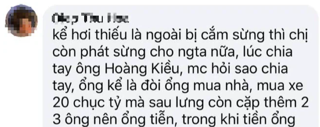 Cũng theo đó, CĐM “đào” lại một buổi phỏng vấn với báo chí của Hoàng Kiều tại Mỹ. Qua đó, công chúng kinh ngạc khi Hoàng Kiều bất ngờ tố ngọc Trinh “bắt cá 2 tay”. Tuy đề nghị không nhắc đến tên Ngọc Trinh nhưng Hoàng Kiều vẫn thẳng thắn chia sẻ: "Bởi vậy tôi mới bỏ đó. Tôi biết khi người đó đến với mình, ai cũng chửi tôi. Yêu cũng chửi, không yêu cũng chửi, bỏ rồi cũng chửi. Đó bây giờ họ mới khui ra hết, thấy không được. Tôi đã từng rất vui khi có được người tình ở tuổi này chứ, thậm chí tôi còn từng muốn có 2 đứa con nữa".
