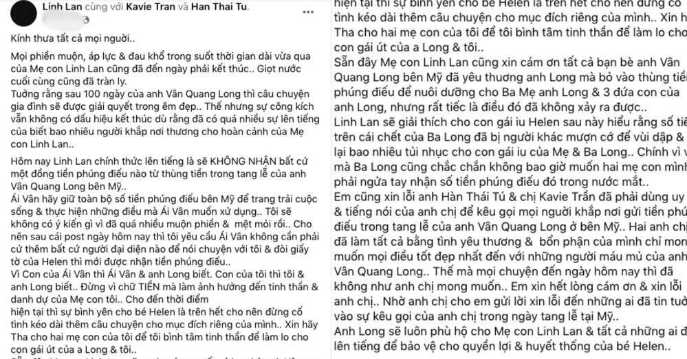 Linh Lan cũng tức giận “vạch mặt” vợ đầu Vân Quang Long: “Hôm nay Linh Lan chính thức lên tiếng là sẽ không nhận bất cứ một đồng tiền phúng điếu nào từ thùng tiền trong tang lễ của anh Vân Quang Long bên Mỹ. Ái Vân hãy giữ toàn bộ số tiền phúng điếu bên Mỹ để trang trải cuộc sống và thực hiện những điều mà Ái Vân muốn sử dụng. Tôi sẽ không có ý kiến gì vì đã quá nhiều muộn phiền, mệt mỏi rồi. Cho nên sau cái post ngày hôm nay thì tôi yêu cầu Ái Vân không cần phải cử thêm bất cứ người đại diện nào để nói chuyện với tôi và đòi giấy tờ của Helen thì mới được nhận tiền phúng điếu”.