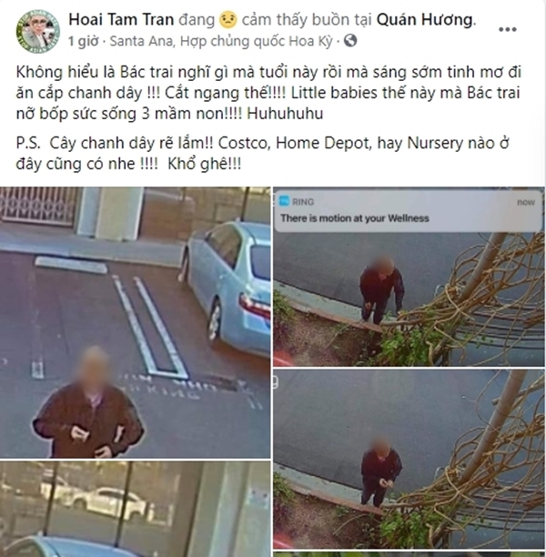 Cụ ông đi xe hơi, ngang nhiên lấy kéo cắt những nhánh cây leo ngay trước cửa quán ăn. “Không hiểu là Bác trai nghĩ gì mà tuổi này rồi mà sáng sớm tinh mơ đi ăn cắp chanh dây!, cắt ngang thế!, Little babies thế này mà Bác trai nỡ bốp sức sống 3 mầm non! Tâm thấy đây là hành động phá hoại vì Bác trai cắt một lúc 3 nhánh và nhổ bứng luôn rễ 3 cây con lên", Hoài Tâm bức xúc cho biết.