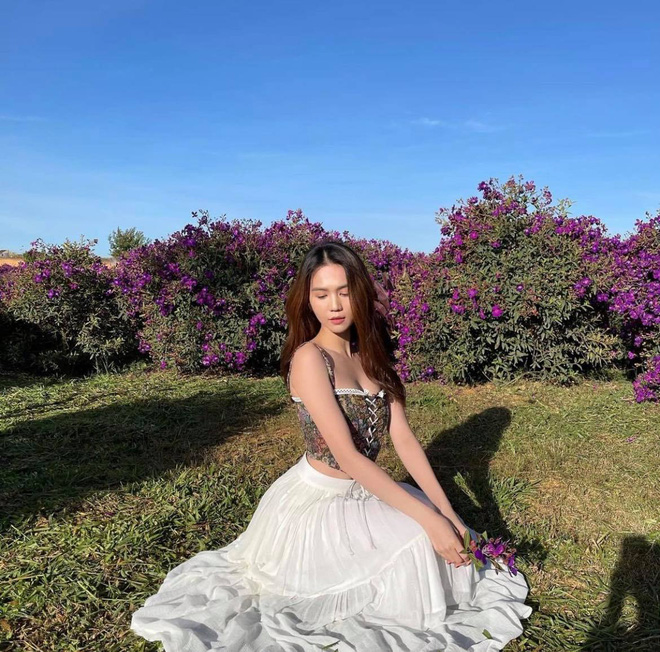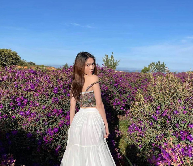 Mỹ nhân gốc Trà Vinh lại khiến dân tình trầm trồ khi diện váy trắng thanh thoát, hóa nàng thơ giữa vườn hoa tím đẹp như tranh. Điều đặc biệt, Ngọc Trinh còn lựa chọn một chiếc áo 2 dây cách điệu “nửa kín nửa hở”, phô diễn trọn đường nuột nà và vòng 1.