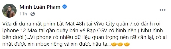 “Vừa đi dự ra mắt phim Lật mặt: 48h tại ViVo City quận 7 có đánh rơi iPhone 12 Max tại gần quầy bán vé Rạp CGV. Vì phone có nhiều dữ liệu quan trọng nên rất cần xin lại, có ai nhặt được xin inbox riêng và xin được hậu tạ", Minh Luân chia sẻ. Nhiều sao Việt đã đã để lại bình luận an ủi nam diễn viên và mong may mắn sẽ mỉm cười với anh.