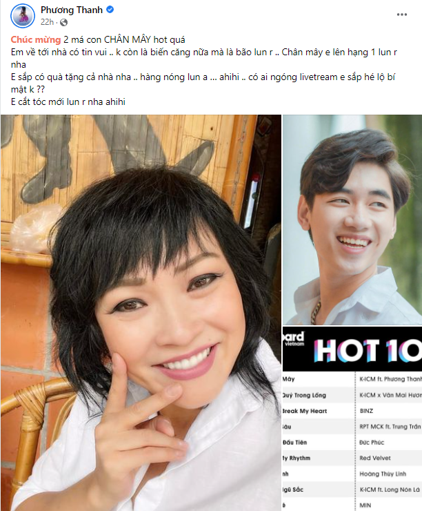Mới đây, trên trang Facebook cá nhân, ca sĩ Phương Thanh bất ngờ đăng tải tin vui lớn của bản thân. Qua đó, ca khúc Chân Mây kết hợp K- ICM đã đứng Top 1 trong Top 11 Billboard Việt Nam.