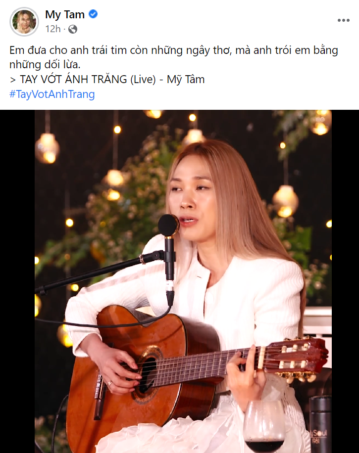 Qua đó, đính kèm dòng trạng thái tâm trạng, là bản live ca khúc “Tay vớt ánh trăng” của nữ ca sĩ mới ra mắt. Dưới bài đăng, rất nhiều bình luận khen ngợi về giọng hát của nữ ca sĩ.