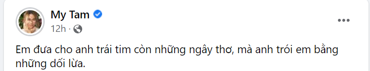 Cách đây ít giờ, Mỹ Tâm bất ngờ đăng tải dòng trạng thái buồn bã trên trang cá nhân khiến dân tình không khỏi xôn xao. Cụ thể, nữ ca sĩ viết: “Em đưa cho anh trái tim còn những ngây thơ, mà anh trói em bằng những dối lừa”.