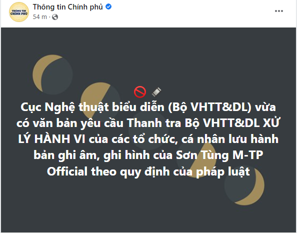 Cách đây ít phút, trên Fanpage Thông tin Chính phủ đưa thông tin Cục Nghệ thuật biểu diễn (Bộ VHTT&DL) vừa có văn bản yêu cầu Thanh tra Bộ VHTT&DL XỬ LÝ HÀNH VI của các tổ chức, cá nhân lưu hành bản ghi âm, ghi hình của Sơn Tùng M-TP Official theo quy định của pháp luật.