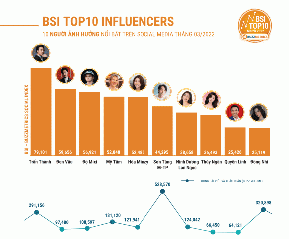 Tính đến thời điểm hiện tại, bảng xếp hạng BSI Top10 của Buzzmetrics là bảng xếp hạng đã trải qua hành trình 5 năm với mục tiêu mang lại bộ tiêu chuẩn đánh giá chung cho tất cả các chiến dịch truyền thông, kèm theo đó là mức độ ảnh hưởng của các sao Việt trên mạng xã hội trong 1 tháng.