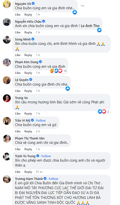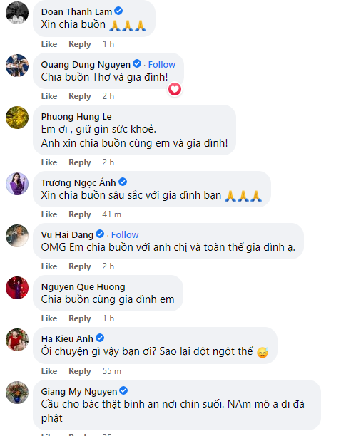 Sự ra đi đột ngột của mẹ vợ diễn viên Bình Minh khiến khán giả vô cùng bất ngờ và xót xa. Bên cạnh đó, nhiều sao Việt cũng gửi lời chia buồn đến gia đình nam diễn viên Bình Minh. Nguyên Vũ, NS Hữu Châu, Lệ Quyên, Ốc Thanh Vân, Thanh Lam, Trương Ngọc Ánh,… để lại bình luận nhằm an ủi mất mát của gia đình nam diễn viên.