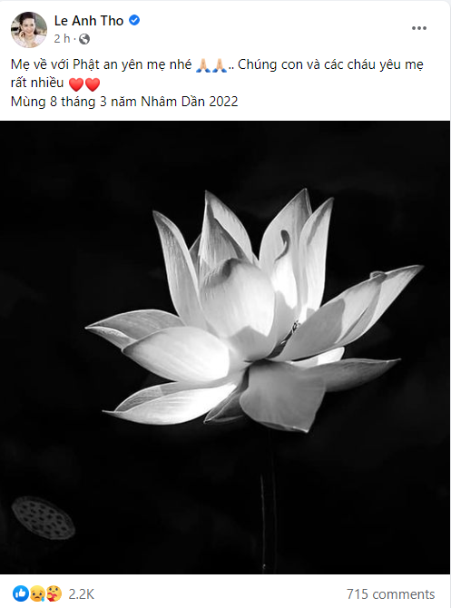 Cách đây ít giờ, bà xã của Bình Minh đã bất ngờ thông báo việc người thân của mình vừa qua đời. Qua đó, doanh nhân Anh Thơ nói lời tạm biệt ngắn gọn đến phụ huynh nhưng đầy xúc động: “Mẹ về với Phật an yên mẹ nhé. Chúng con và các cháu yêu mẹ rất nhiều. Mùng 8 tháng 3 năm Nhâm Dần 2022".
