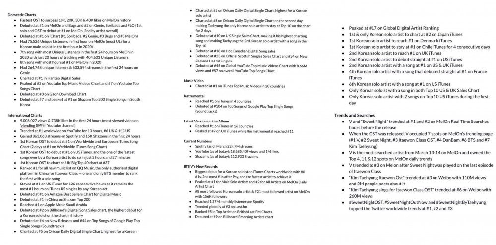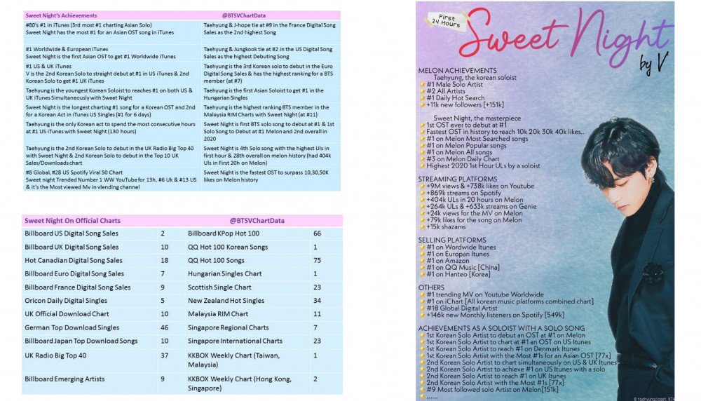Vào ngày 21/5 , "Sweet Night" – ca khúc do V (BTS) thể hiện dẫn đầu trên bảng xếp hạng bài hát hàng đầu iTunes tại 82 quốc gia bao gồm các thị trường âm nhạc lớn như Mỹ, Anh và Pháp mặc dù không hề quảng cáo và đề cập đến BTS.