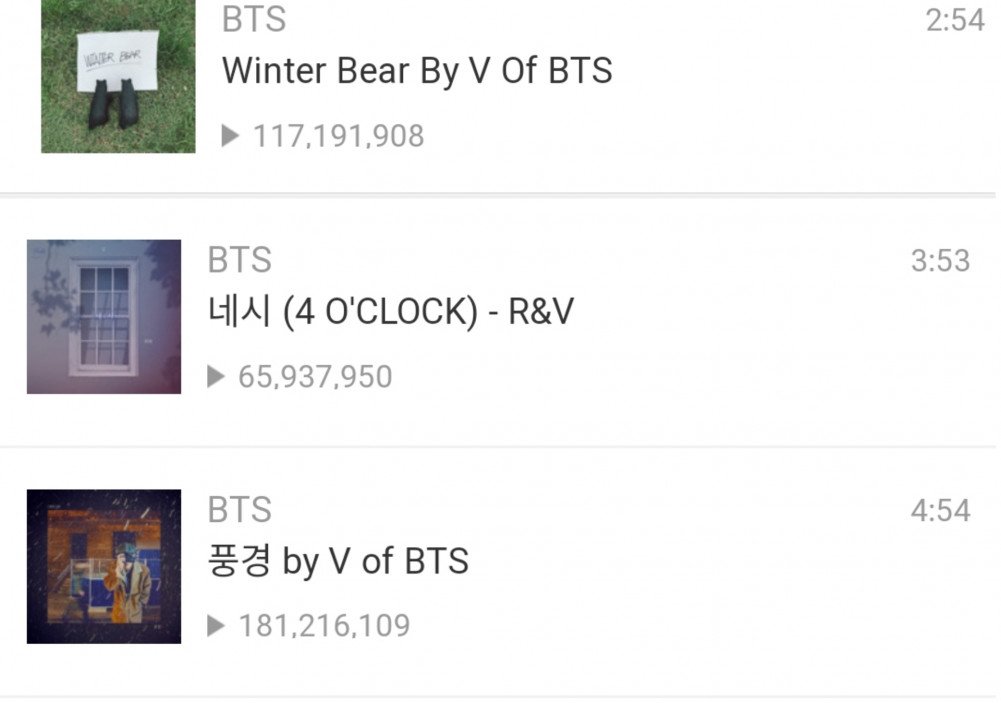 Ngoài ra, V hiện đã thiết lập một số kỷ lục lớn với các bài hát tự sáng tác, tự sáng tác và tự sản xuất trong nền tảng âm nhạc SoundCloud: Nghệ sĩ solo Hàn Quốc đầu tiên có 2 bài hát lọt '50 bài hát được phát trực tiếp nhiều nhất trên SoundCloud và nghệ sĩ solo Hàn Quốc đầu tiên có 3 bài hát với hơn 65 triệu lượt nghe trên SoundCloud. Cả ba bài hát của V đều nằm trong “10 bài hát hay nhất trên BTS trên SoundCloud”.