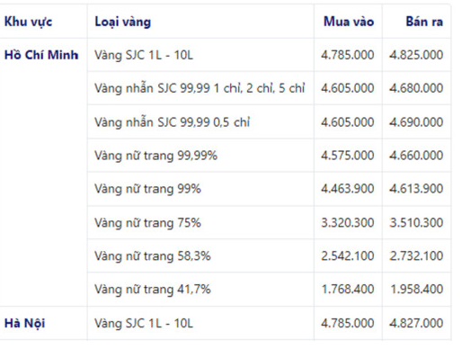 Riêng hệ thống PNJ, giá vàng đứng yên ở cả hai chiều mua – bán của cả 2 chi nhánh Hà Nội và Sài Gòn so với chốt phiên cuối tuần qua. Hiện tại, giá trần mua vào của àng miếng SJC ở mốc 47,85 triệu đồng/ lượng và giá trần bán ra của vàng miếng SJC đạt mức 48,4 triệu đòng/lượng.