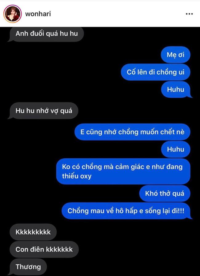 Trước đó, Hari Won cũng đăng tải đoạn tin nhắn mùi mẫn với chồng khiến ai cũng ghen tị. Cụ thể, khi Trấn Thành than thở mệt mỏi và rất nhớ vợ, Hari Won cũng đáp lại đầy tình cảm: “"Em cũng nhớ chồng muốn chết nè", "Không có chồng mà cảm giác em như đang thiếu oxy, khó thở quá", "Chồng mau về hô hấp cho em sống lại đi". Tuy nhiên, “A Xìn” lại lầy lội gọi vợ là “con điên” vì những lời sến súa mà Hari Won dành tặng. Cuối cùng “ông chồng quốc dân” cũng để lại lời nhắn an ủi đầy ngọt ngào cho vợ: “Thương”.