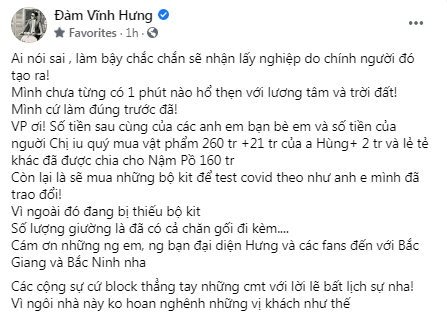 Đàm Vĩnh Hưng cũng lập tức chuyển khoản 100 triệu đồng, ủng hộ cho tỉnh Bắc Giang chống dịch Covid-19. Anh cũng đanh thép rằng sẽ chặn “thẳng tay” những lời lẽ bất lịch sự và không hoan nghênh những người không có thành ý.