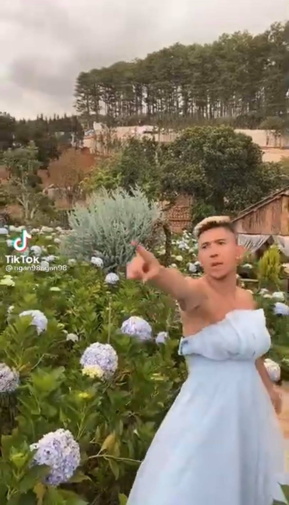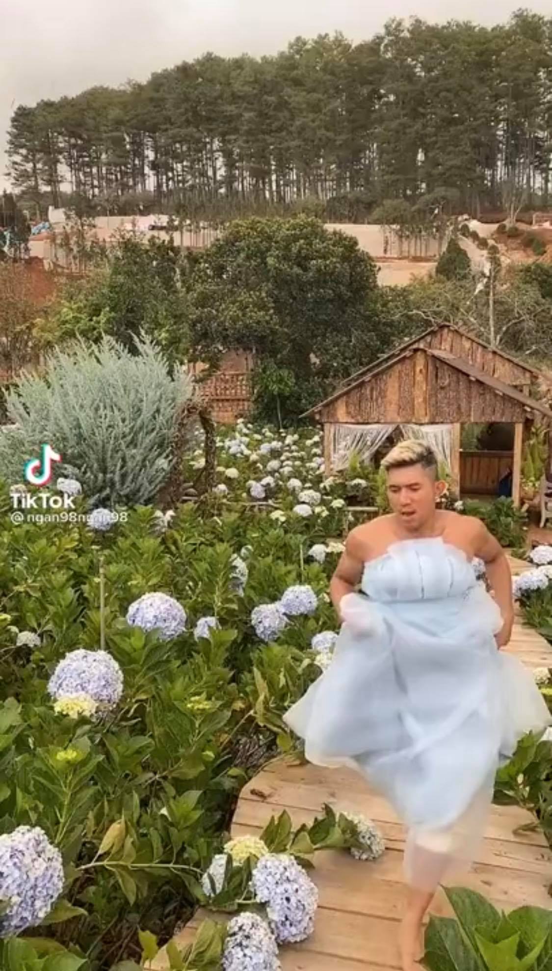 Qua đó, nam ca sĩ mặc một bộ đầm xanh vô cùng nữ tính, không kéo hết khóa chạy nhảy, tạo dáng hát nhép ở vườn hoa tại Đà Lạt. Bạn trai Ngân 98 còn tỏ ra thích thú, đăng tải với dòng trạng thái: “Nghe nói đang hot trên Tiktok, 1 triệu view up bộ ảnh full không che”.