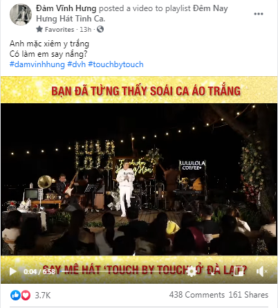 Qua đó, trong lúc livestream của bà Phương Hằng đang diễn ra, Đàm Vĩnh Hưng đã có ngay thông báo tạm hoãn livestream của mình trên Facebook. Anh cho biết vì hệ thống máy móc, âm thanh có vấn đề nên không thể lên sóng với khản giả như đã hẹn. Nam ca sĩ cũng không quên an ủi người hâm mộ, hứa sẽ sửa chữa một cách nhanh nhất.