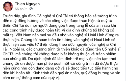 “Trước đây, gia đình cố nghệ sĩ Chí Tài có thông báo sẽ tường trình đến quý đồng hương về các công việc được thực hiện từ quỹ từ thiện Chí Tài do mọi người đóng góp trong tang lễ của anh sau khi các công trình này được hoàn tất.