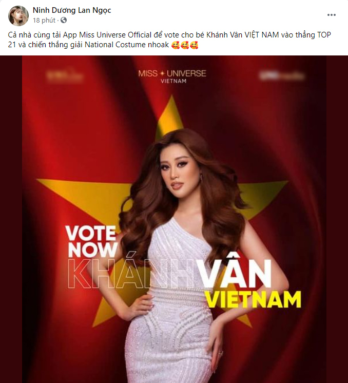 Nhưng chính vì điều này, Ninh Dương Lan Ngọc lại bị CĐM chỉ trích dữ dội suốt nhiều giờ qua. Cụ thể, vào ngày hôm qua (16/5), trên trang cá nhân của mình, Lan Ngọc có bài đăng kêu gọi khán giả bình chọn cho Khánh Vân để đại diện Việt Nam có thể vào thẳng Top 21 và đoạt giải trang phục dân tộc.