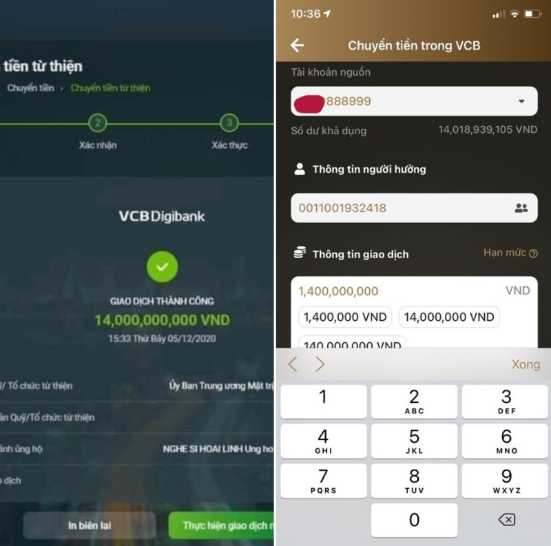 Mình gõ đúng tài khoản của Uỷ Ban Trung Ương Mặt Trận Tổ Quốc Việt Nam – theo số tài khoản trong ảnh kia. Gõ 14 tỏi nhưng đương nhiên không thể được, chỉ tới 1,4 tỏi là nó hết số, không thể gõ tiếp. Hơn nữa, cái ảnh kia cho thấy tài khoản chuyển đi là tài khoản thường vì nó có màu xanh. Tài khoản VIP thì nó phải có giao diện màu vàng. Mà Hoài Linh thì không thể dùng tài khoản xanh được, ổng giàu mà.