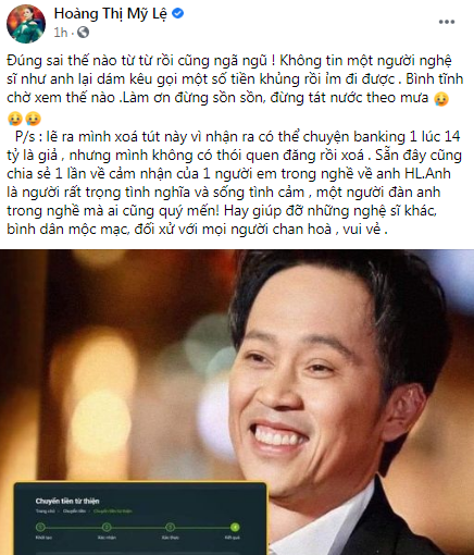 “Lẽ ra mình xoá stt này vì nhận ra có thể chuyện banking 1 lúc 14 tỷ là giả , nhưng mình không có thói quen đăng rồi xoá . Sẵn đây cũng chia sẻ 1 lần về cảm nhận của 1 người em trong nghề về anh Hoài Linh. Anh là người rất trọng tình nghĩa và sống tình cảm , một người đàn anh trong nghề mà ai cũng quý mến! Hay giúp đỡ những nghệ sĩ khác, bình dân mộc mạc, đối xử với mọi người chan hoà , vui vẻ “, Mỹ Lệ bộc bạch.
