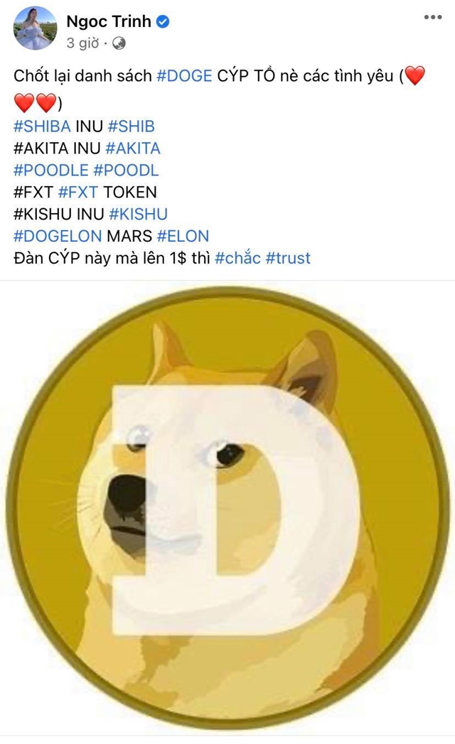 Mới đây, cộng đồng mạng được phen xôn xao khi Ngọc Trinh công khai khoe mình đang sở hữu một lượng Bitcoin tương đương 10.7 triệu USD. Ngoài ra, cô còn công khai động viên những người quan tâm hãy mua 2 đồng coin đang rất hot hiện tại là Doge và Shiba Token.