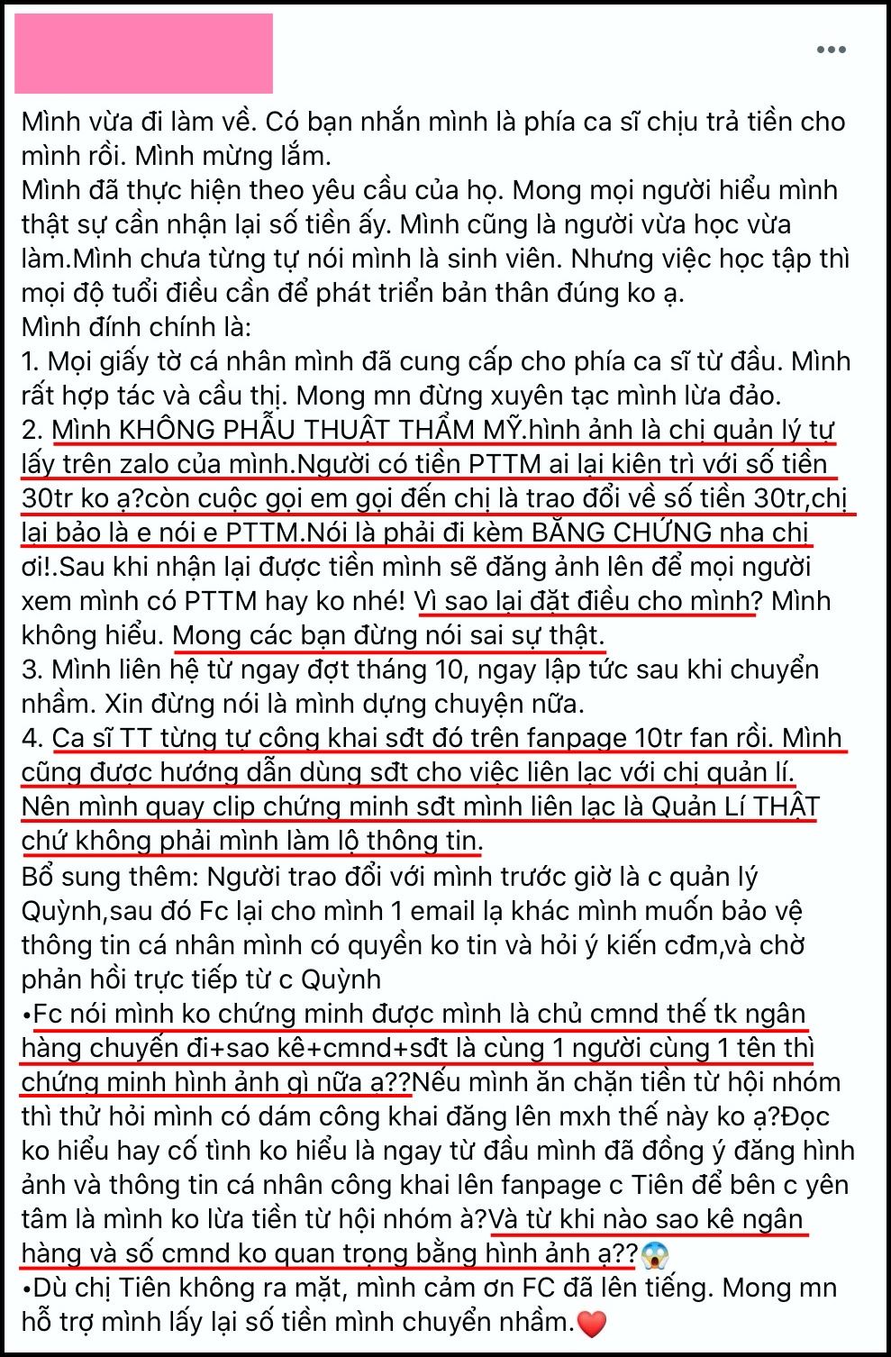 "Mình không phẫu thuật thẩm mỹ. Hình ảnh là chị quản lý tự lấy trên Zalo của mình. Người có tiền phẫu thuật thẩm mỹ ai lại kiên trì với số tiền 30 triệu phải không ạ? Còn cuộc gọi em gọi đến chị là trao đổi về số tiền 30 triệu, chị lại bảo em nói em phẫu thuật thẩm mỹ. Nói là phải đi kèm bằng chứng nha chị ơi!", T.H còn nói thêm, sau khi nhận được tiền hoàn trả, cô sẽ đăng hình ảnh hiện tại và ảnh CMND lên để khán giả “nói lời công bằng”.