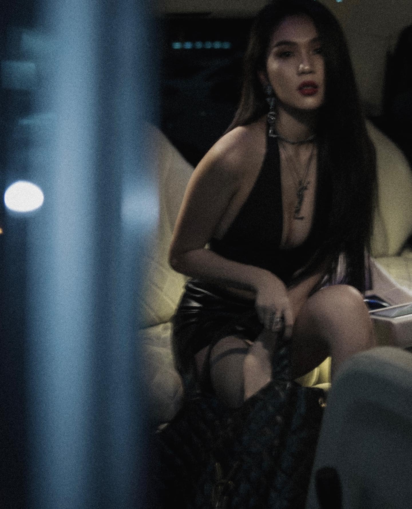 Mới đây nhất, Ngọc Trinh bất ngờ đăng loạt ảnh dạo phố dưới mưa đầy nóng bỏng. Cụ thể, “nữ hoàng nội y” mặc một bộ đồ đen ngắn cũn cỡn, điểm nhấn là chiếc áo 2 dây khoét sâu, để lộ tất cả vòng 1 nóng bỏng ra ngoài.