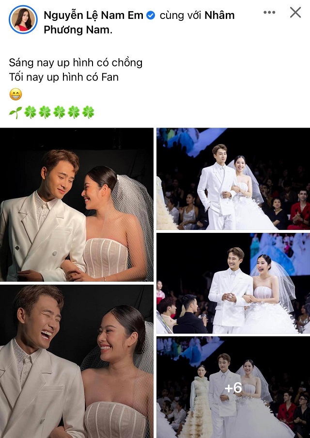 Nam Em đăng ảnh mặc váy cưới, gọi sao nam nổi tiếng là 'chồng', còn tag thẳng tên thế này đây!Mới đây, trên trang Facebook cá nhân, Nam Em khoe loạt ảnh diện váy cưới lộng lẫy kèm caption: "Sáng nay up hình có chồng. Tối nay up hình có Fan".