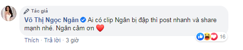 Ngân 98 sau thời gian im lặng của đã lên tiếng. “Hot girl thị phi” này không trực tiếp nhắc đến việc mình và người yêu bị đánh đồng thời giữ thái độ thản nhiên khi nhắc đến vụ việc. Dưới bình luận, Ngân 98 còn tuyên bố: “Ai có clip Ngân bị đập thì post nhanh và share mạnh nhé. Ngân cảm ơn”.