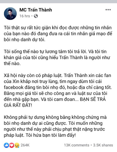 Có thể thấy, Trấn Thành sẽ làm thật mạnh tay những tin đồn vô căn cứ gây mất danh dự cho mình. Đây cũng chính là hồi chuông cảnh tỉnh cho những người dùng mạng xã hội nhằm tung tin thất thiệt, gây ảnh hưởng xấu đến danh dự cũng như hình ảnh của người khác.