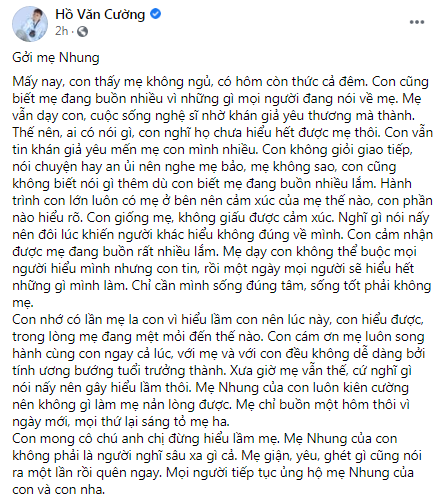 Cách đây ít phút, Hồ Văn Cường đã chính thức đăng tải tâm thư lên trang cá nhân. Qua đó, nam ca sĩ trẻ đã lên tiếng bênh vực và gửi lời cảm ơn đến mẹ nuôi vì đã chăm sóc, dạy dỗ anh. Đặc biệt, Hồ Văn Cường cho biết nhiều ngày nay rất buồn, thức khuya và không ngủ được.