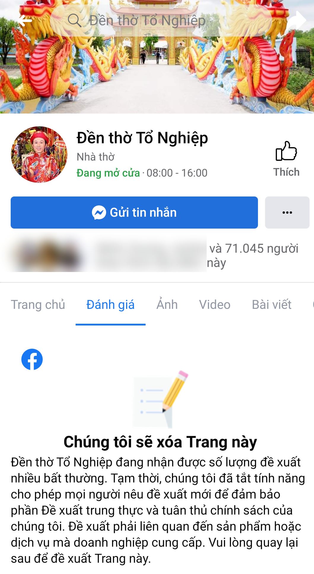 Giữa lúc lùm xùm còn chưa dứt, khán giả lại bất ngờ phát hiện ra Fanpage nhà thờ Tổ nghiệp (được Hoài Linh dày công xây dựng vào năm 2016) đang có nguy cơ bị xóa sổ. Theo như quan sát, vì vụ lùm xùm nên đã rất đông người vào báo cáo khiến fanpage bị tắt tính năng đề xuất. Được biết, fanpage này đã được tạo cách đây 5 phút và hiện thu hút gần 120 nghìn lượt người theo dõi.