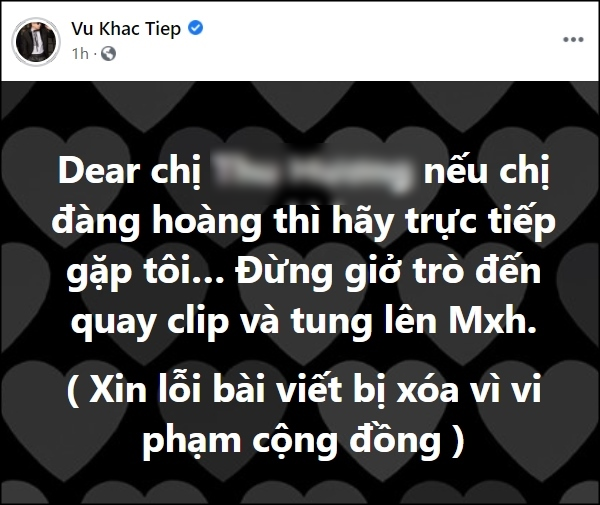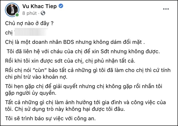 “Chủ nợ nào ở đây? Chị TH, chị là một doanh nhân bất động sản nhưng không dám đối mặt. Tôi đã liên hệ với cháu của chị để xin số điện thoại nhưng không được. Rồi khi tôi xin được số điện thoại của chị, chị phủ nhận tất cả. Rồi chị nói cùn, bảo tất cả những gì tôi đã làm cho chị thì cứ tính chi phí trừ vào khoản nợ. Tôi hẹn gặp chị để giải quyết nhưng chị không gặp rồi nhắn tôi gặp người ủy quyền. Tất cả những gì chị làm ảnh hưởng tới gia đình và công việc của tôi. Chị sử dụng trò này không hại được tôi đâu. Tôi sẽ trình báo sự việc với công an", Vũ Khắc Tiệp tức giận đăng đàn trên trang cá nhân.