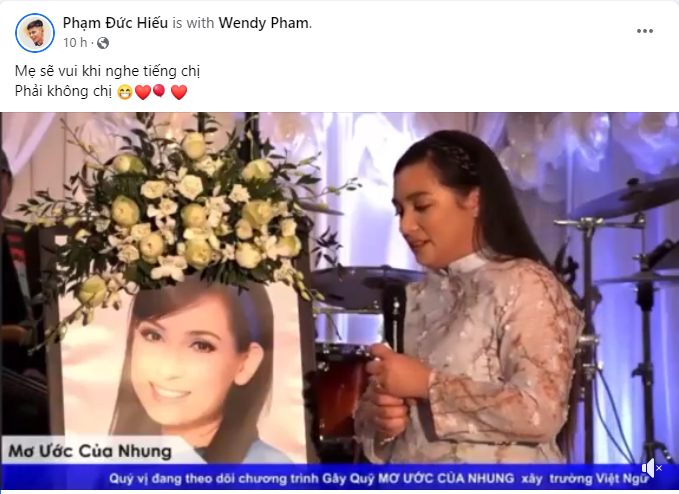 Cách đây ít giờ, Phạm Đức Hiếu – con trai nuôi cố NS Phi Nhung đăng tải clip con gái ruột Phi Nhung hát trong show diễn gây quỹ cố nghệ sĩ tại Mỹ. Qua đó, anh không giấu được xúc động và tag thẳng tên Wendy cùng lời nhắn: “Mẹ sẽ vui khi nghe tiếng chị.Phải không chị”.
