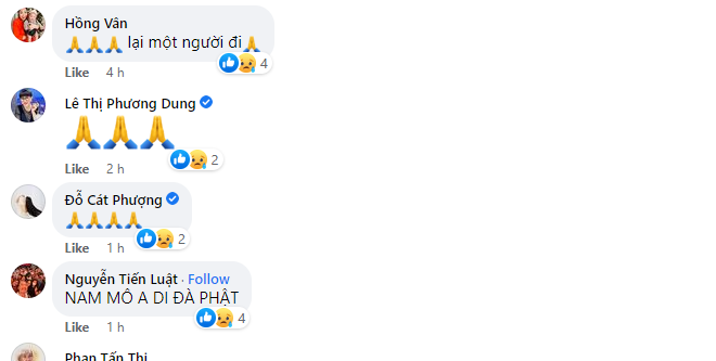 Dưới bài đăng, nhiều sao Việt và khán giả đã không giấu nổi sự bàng hoàng khi nhận tin tang sự từ nam MC. Qua đó, NSND Hồng Vân, Cát Phượng, diễn viên Tiến Luật, Phương Dung, Huỳnh Kiến An,… lần lượt gửi lời chia buồn và không thể tin rằng người đồng nghiệp của mình đã qua đời.