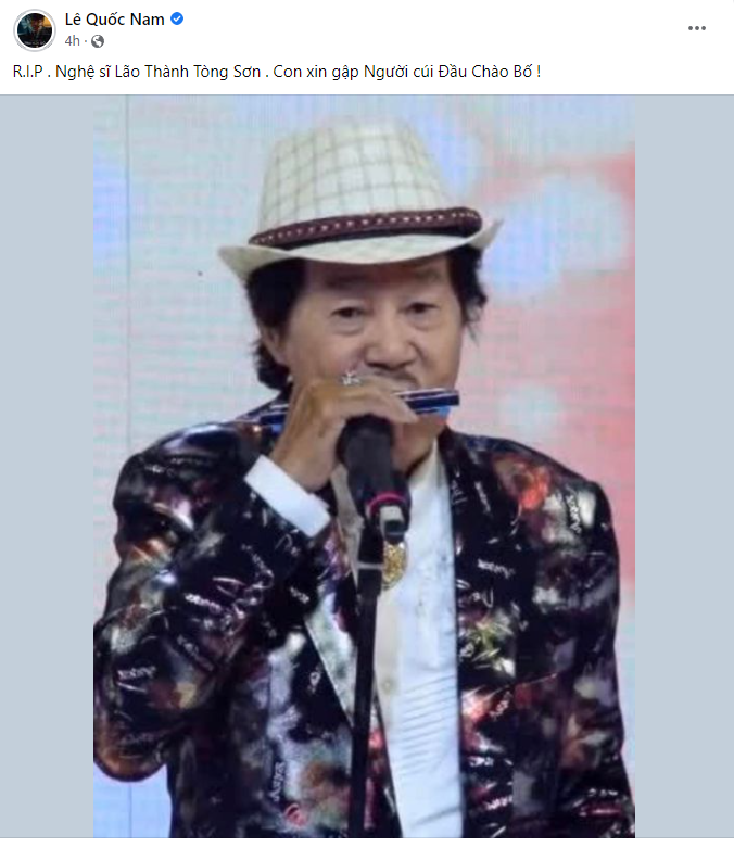 Cách đây ít giờ, nghệ sĩ Lê Quốc Nam bất ngờ đăng tải dòng trạng thái buồn bã, thông báo việc nghệ sũ Tòng Sơn đã qua đời: “R.I.P . Nghệ sĩ Lão Thành Tòng Sơn . Con xin gập Người cúi Đầu Chào Bố!”, nam diễn viên cho biết.