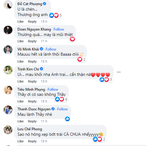 Ngay lập tức dưới bài đăng, rất nhiều sao Việt đã không khỏi bất ngờ và lo lắng cho tình trạng của nam danh hài. Trong đó phải kể đến nghệ sĩ Ngọc Huyền, NSND Hồng Vân, Đàm Vĩnh Hưng, Ốc Thanh Vân, Trịnh Kim Chi,… đều lo lắng hỏi han và mong nam nghệ sĩ có thể hồi phục nhanh chóng.