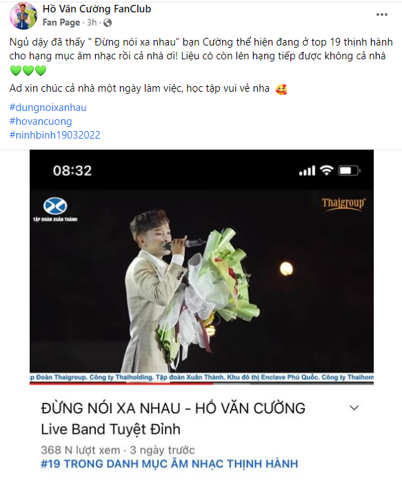 Cách đây ít giờ, một trang Fanpage của người hâm mộ Hồ Văn Cường đăng tải dòng trạng thái vui mừng khoe thành tích của nam ca sĩ: