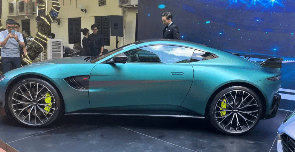 Điểm khác biệt của Aston Martin Vantage F1 Edition so với bản tiêu chuẩn nhờ líp cản trước, vây cá cản trước cùng cánh gió cố định ở đuôi xe. Chiếc xe mới của đại gia Vũ cũng khác biệt khi sở hưu màu sơn xanh Racing và sọc màu xám mờ Solid Matte Dark Grey, cùng bộ mâm đa chấu kích thước 21 inch, có sẵn cùm phanh màu xanh lá chuối.